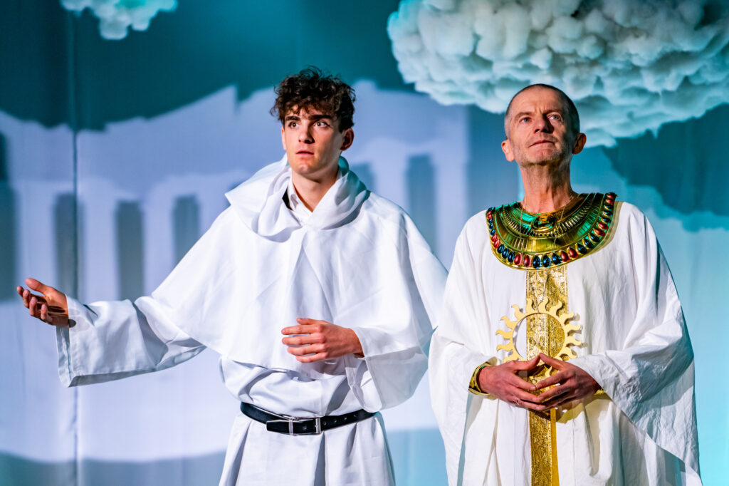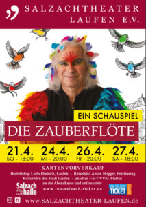 Tamino und Papageno machen sich auf, die entführte Prinzessin Pamina zu befreien. Damit ihnen das gelingen kann, müssen die beiden aber zunächst ihre Fähigkeiten in den großen Prüfungen der Götter unter Beweis stellen. Doch nichts scheint wie es ist und eigentlich ist auch gar nicht mehr so klar, wer hier überhaupt von Wem gerettet werden muss. Gerhard Marx Papageno Bianca Kasper Papagena, Erzählerin Andreas Schweiger Tamino Sofia Gangl Pamina Madeleine Weingarten Königin der Nacht Christian Zink Sarastro Andreas Tauchen Monostatos, Schattengestalt 2 Julian Pilz Priester Sabine Schwangler Schattengestalt 1 Regie: Jule Schäfer Regieassistenz: Andreas Tauchen Technik und Beleuchtung: Oliver Freudenthaler & Bernd Schneider Maske: Salon Inge mit Team Bühnenbild: Ensemble Salzachtheater Bühnenbau: Ensemble Salzachtheater Öffentlichkeitsarbeit: Mia Wegmann, Sofia Gangl, Dominik Riedel & Andreas Tauchen Ein Schauspiel für Erwachsene und Kinder ab acht Jahren. Eintritt € 12,- auf allen Plätzen Menschen mit Behinderung € 6,-